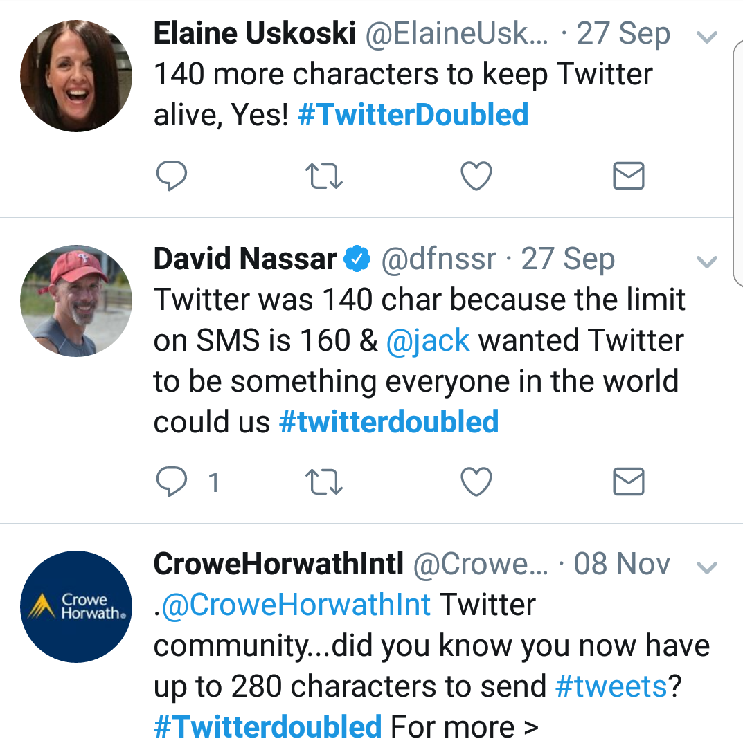 Hello, 280. Twitter is expanding tweets to 280 characters for nearly all users (the change won’t apply to Chinese, Japanese, or Korean languages) after rolling it out to some accounts in September. The company said people tweeted “more easily and more often” with the extended count, but that it didn’t substantially change Twitter’s brief-and-breezy character: Only 1% of users with extra space actually hit the limit. It’s all part of the social network’s efforts to grow users and engagement. • Share your thoughts: #TwitterDoubled